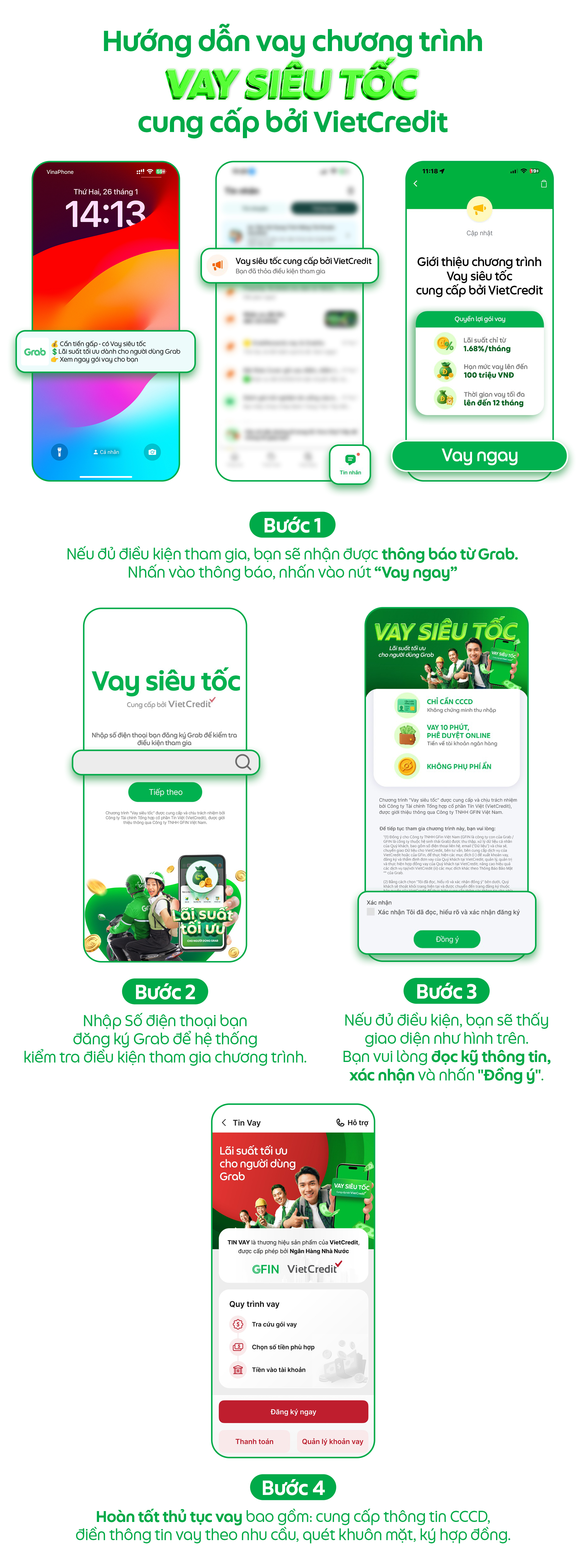 Từ 26/02/2026, VietCredit và GFIN (GFIN - Công ty thuộc hệ sinh thái Grab) chính thức triển khai thí điểm chương trình “Vay Siêu Tốc” cho một số người dùng nhận thông báo từ Grab tại khu vực Thành phố Hồ Chí Minh (không bao gồm khu vực Bà Rịa - Vũng Tàu) và Hà Nội.